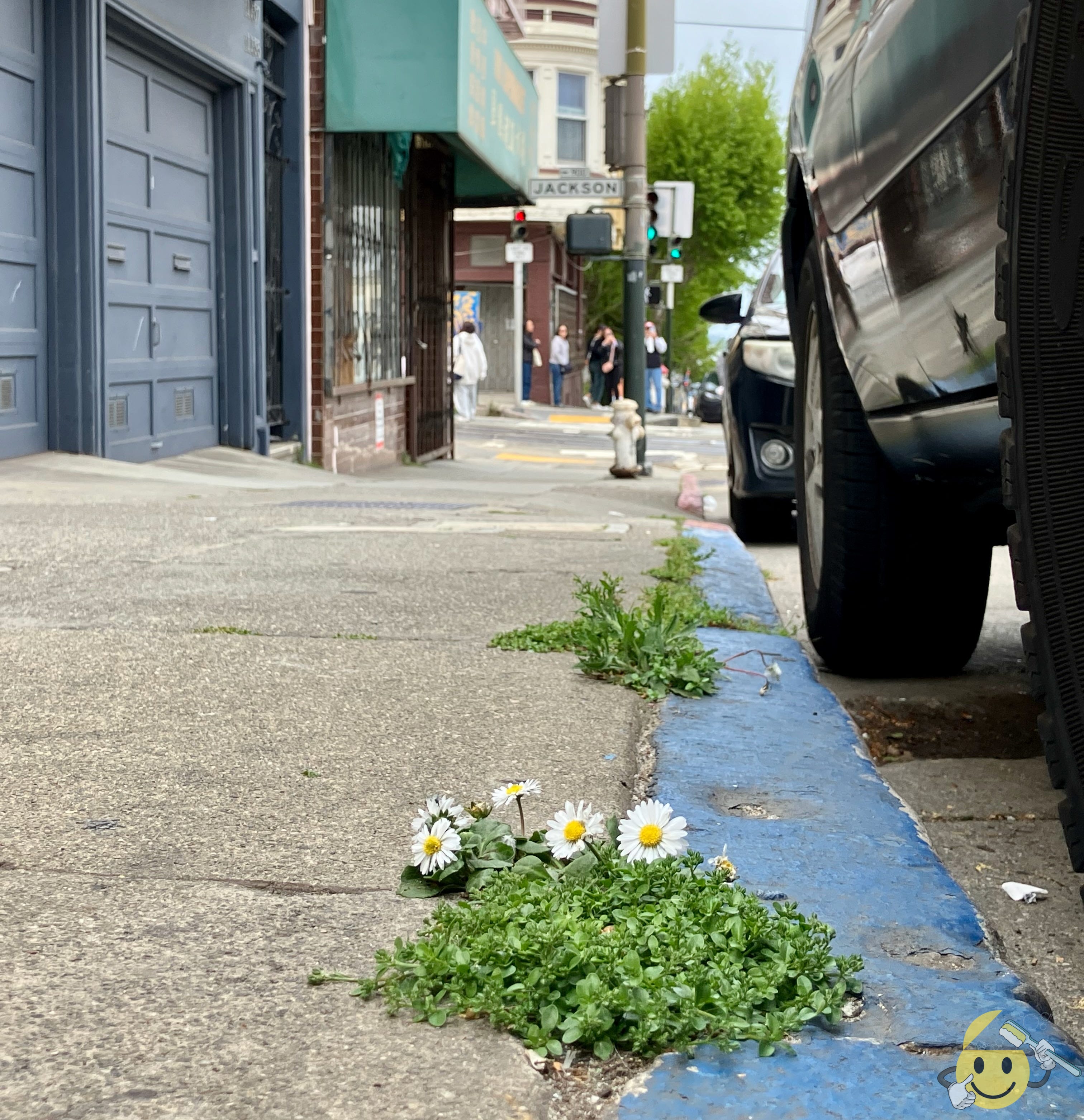 A few weeks earlier, I had been walking by a meadow in Switzerland and spotted small daises in the grass. That was delightful especially because…well…just because it’s always delightful to discover small flowers in nature. But back in San Francisco, I happened to spot the same kind of miniature daisies growing out of a concrete sidewalk!